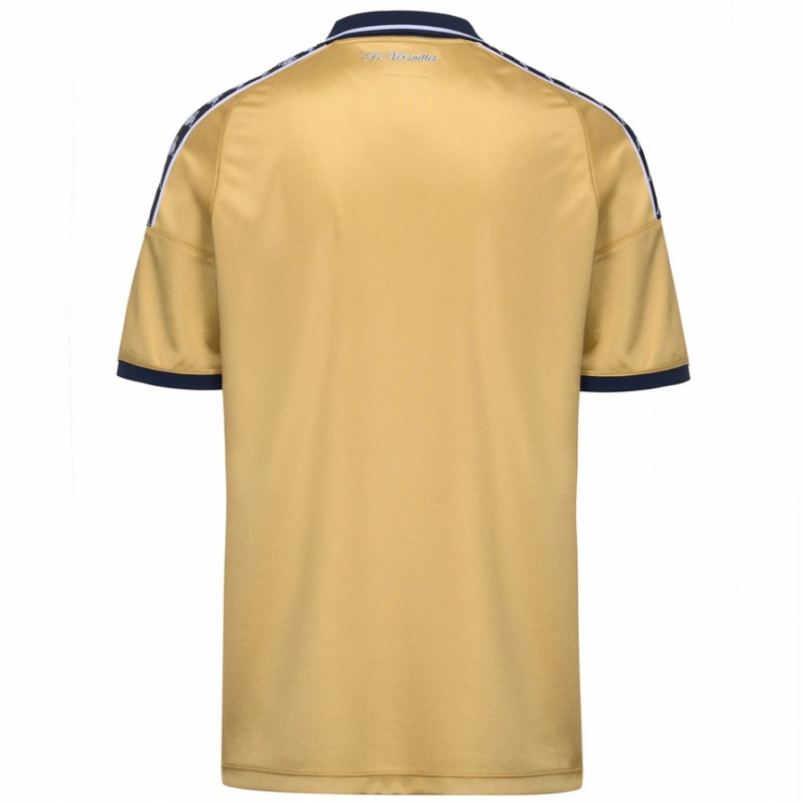 Kappa FC Versailles 2025-26 "L'Audacieux" special edition jersey, which features a gold base with a central navy blue and white stripe. GARA. Game shirt KOMBAT™ 2025 for man with HYDRO-WAY PROTECTION technology.