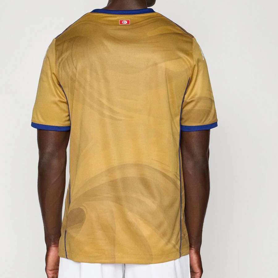 Stand out with the Tunisia Third Jersey 2026, designed in a striking gold finish with deep navy details. This jersey delivers a premium modern look while celebrating the bold spirit of the Eagles of Carthage. The swirling pattern across the front adds movement and texture, making it one of the most unique Tunisia kits of the season.