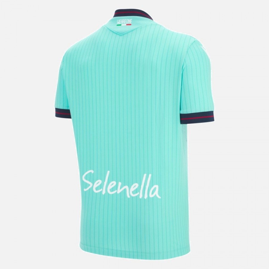 A blend of modern design and city identity: the new 2025/26 third jersey celebrates one of Bologna’s most iconic symbols, Neptune, depicted with an elegant tone-on-tone pinstripe pattern on a refined light blue base. The crew neck and red-and-blue sleeve cuffs recall the club’s colors, while the Macron Hero and the BFC 1909 crest stand out on the chest in white silicone print.