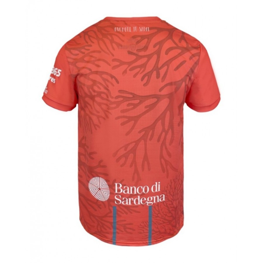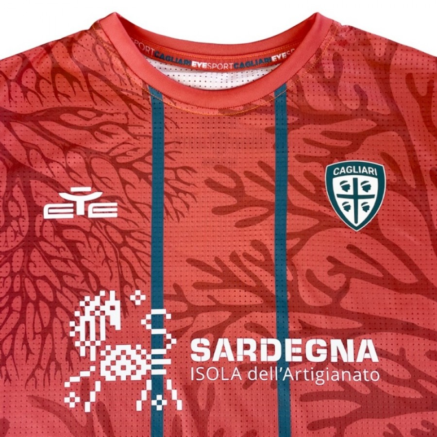 A silent power lies hidden within the ocean. It yields neither to time nor to pressure. It is still yet full of vitality, always ready to absorb impact and retaliate with equal force. Resistance is transformed into kinetic energy. This is the origin of the Gara Fourth “Reef Tide” jersey. It is made from Repreve-certified recycled yarn in Dimple polyester fabric, paired with rounded mesh sleeves. The design is inspired by Mediterranean coral and adorned with contrasting vertical stripes. This jersey perfectly blends sustainability, technical design, and professional performance, making it ideal for football and high-intensity sports. The front features the Cagliari Football Club shield logo and the EYE Sport logo, both made from the latest generation of silicone, reducing weight by over 70%. Ribbed collar and cuffs. A personalized sweatband with “Cagliari” and “EYE Sport” printed on the inside of the collar. The upper back of the jersey features Cagliari fans' iconic slogan, “Ovunque tu sarai” (Ovunque tu sarai).