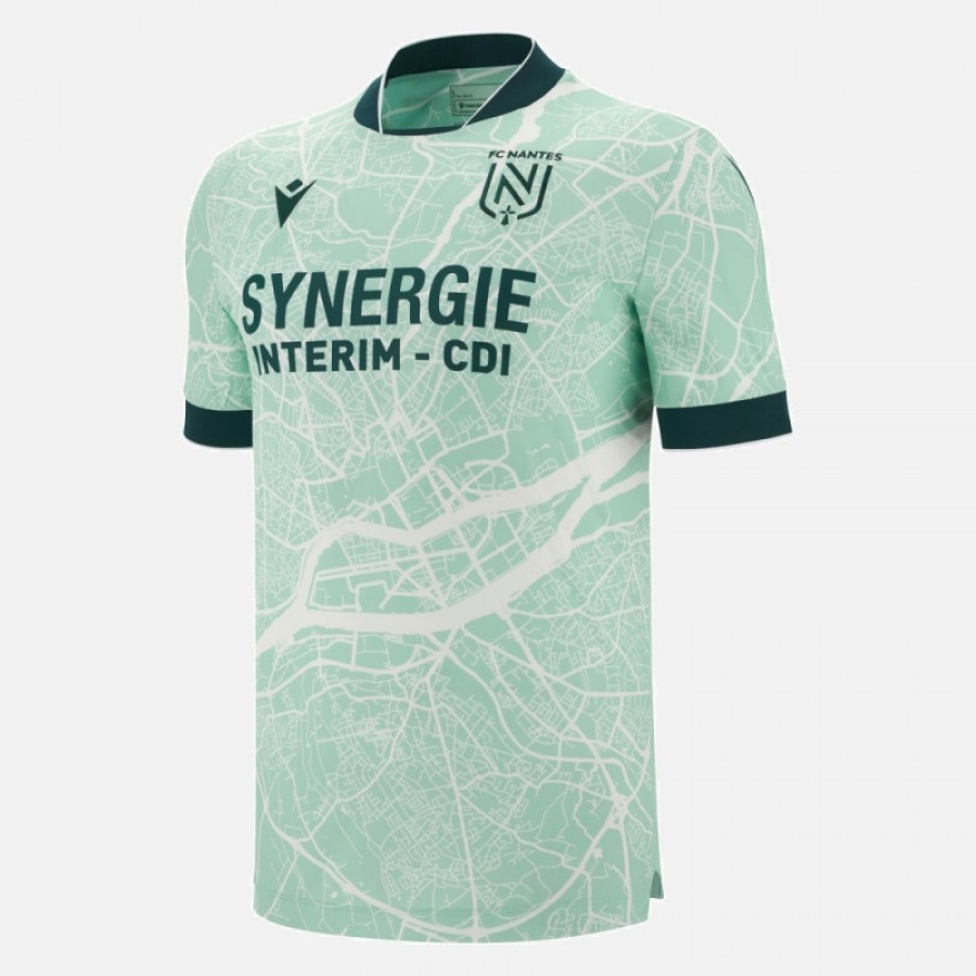 The 25-26 FC Nantes Men's Away Jersey is presented in a refined aqua green tone, enriched by a sublimated graphic that reproduces the city map, a symbol of the club's territorial identity. The Korean style collar and dark green sleeve cuffs add elegance and contrast. On the back, the word 'NAONED', the Breton name for Nantes, appears in embossed print. The garment is made from Eco Softlock with Eco Mesh inserts, offering lightness, breathability and optimal comfort.