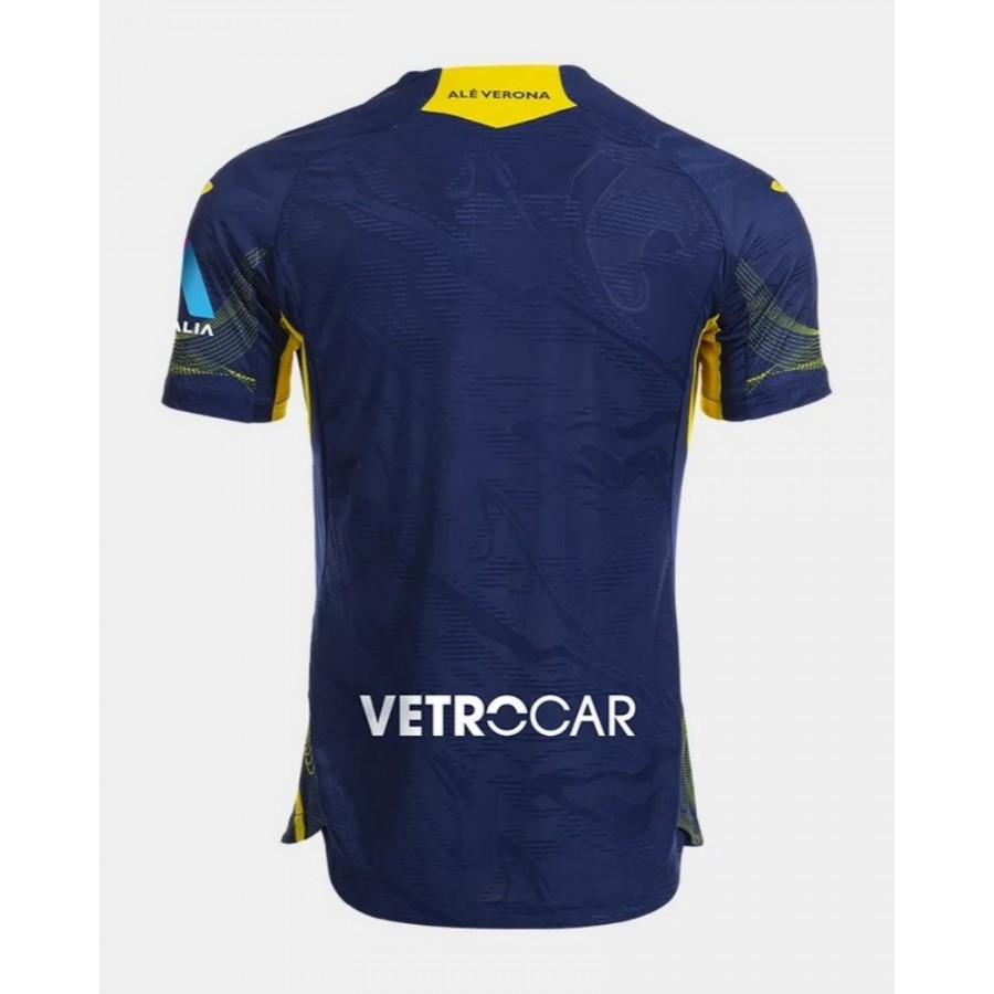 The Joma Hellas Verona F.C. jersey for the 2025–2026 season has a deep blue background with cool yellow graphics on the sleeves and lower front area.