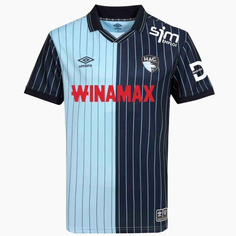 The Umbro Le Havre 25-26 football jersey combines HAC’s traditional Cambridge blue and Oxford navy halves, enhanced with fine vertical pinstripes for a refined 90s-inspired look. A bordered collar and subtle details on the back and hem highlight the partnership between the historic French club and the iconic English brand.