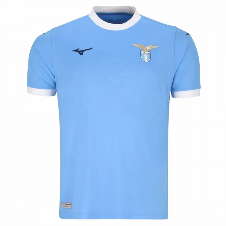 The SS Lazio Home Jersey 25/26 by Mizuno consists of an embossed front body with mesh back and plain set-in sleeves. Solid colour ribbed crew neck collar and sleeve cuffs. Plain back neck tape. Tatami 3D silicone club crest and heat transfer Mizuno logos with additional Mizuno logos to the sleeves. 9 GENNAIO 1900 heat transfer sign off sits at the back neck.