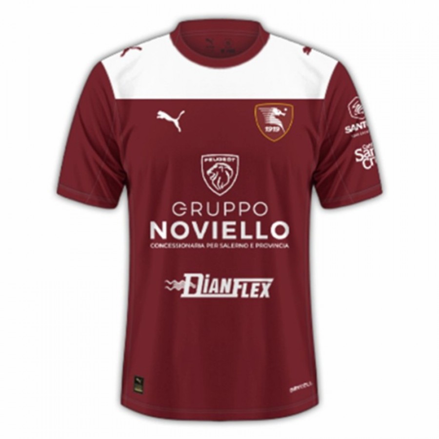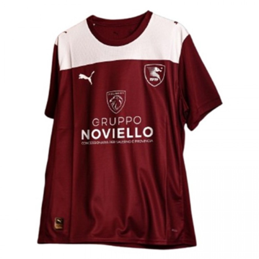 The Salernitana 2025-26 home jersey by Puma features a maroon base. The design includes a white panel across the shoulders and upper chest, with a white round-neck collar. Several sponsors are visible on the front and sleeves.