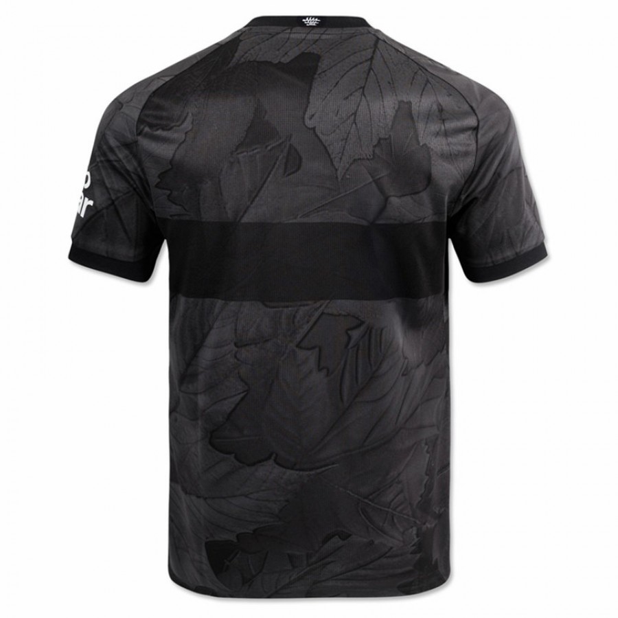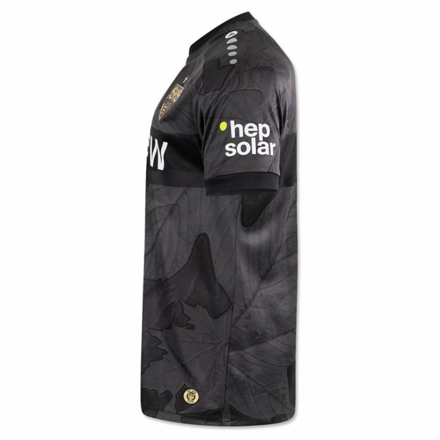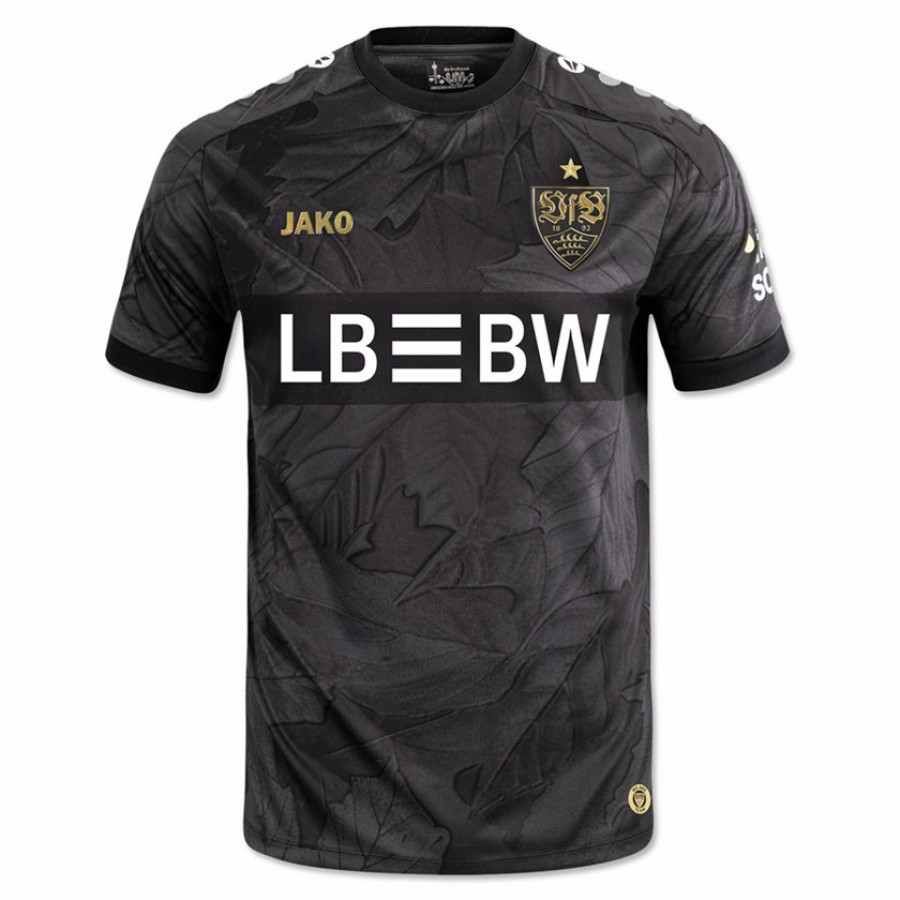 The Jako Stuttgart 2025-26 third jersey comes in a sleek black base with an elegant all-over leaf pattern. The tonal design fuses various leaf shapes, symbolizing the lush forests that surround the Stuttgart basin. It’s a visual homage to the cultural and natural richness of the region.