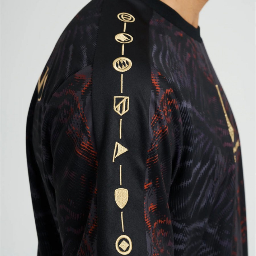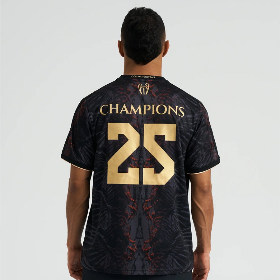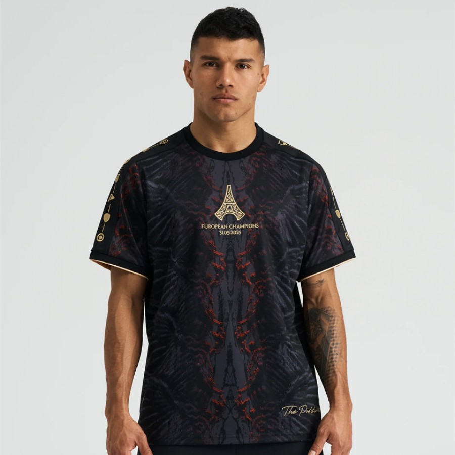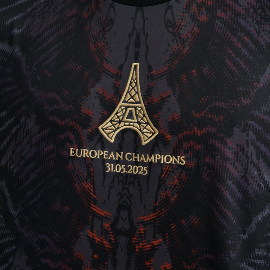 A wing-inspired jersey for PSG - your 2025 UCL champions. A wing-inspired black and red base. Every club they've played - embroidered in gold. An embroidered Eiffel Tower front crest, and 'The Parisians', signed in gold. A redesigned trophy logo for their first-time European champions.